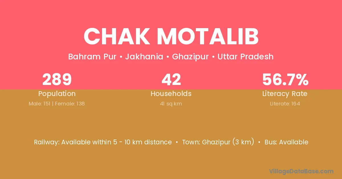 Ghazipur (3 km) is the nearest town to Chak Motalib village for major economic activities and is located approximately 3 km away.
