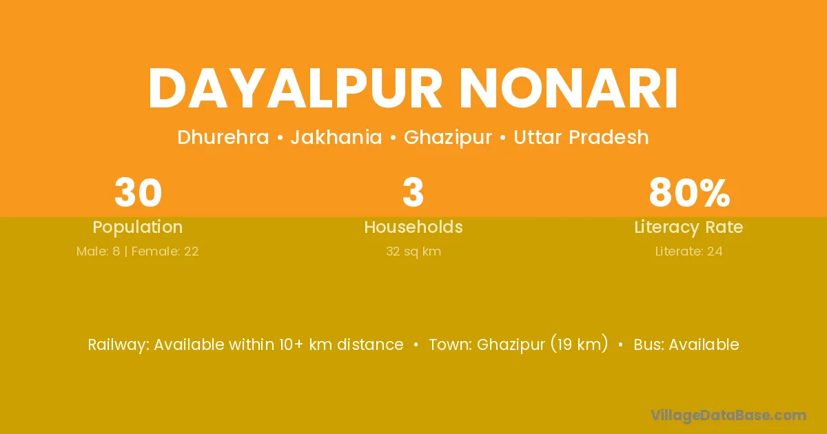 Ghazipur (19 km) is the nearest town to Dayalpur Nonari village for major economic activities and is located approximately 19 km away.