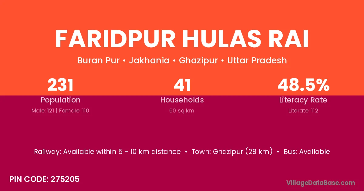 Ghazipur (28 km) is the nearest town to Faridpur Hulas Rai village for major economic activities and is located approximately 28 km away.