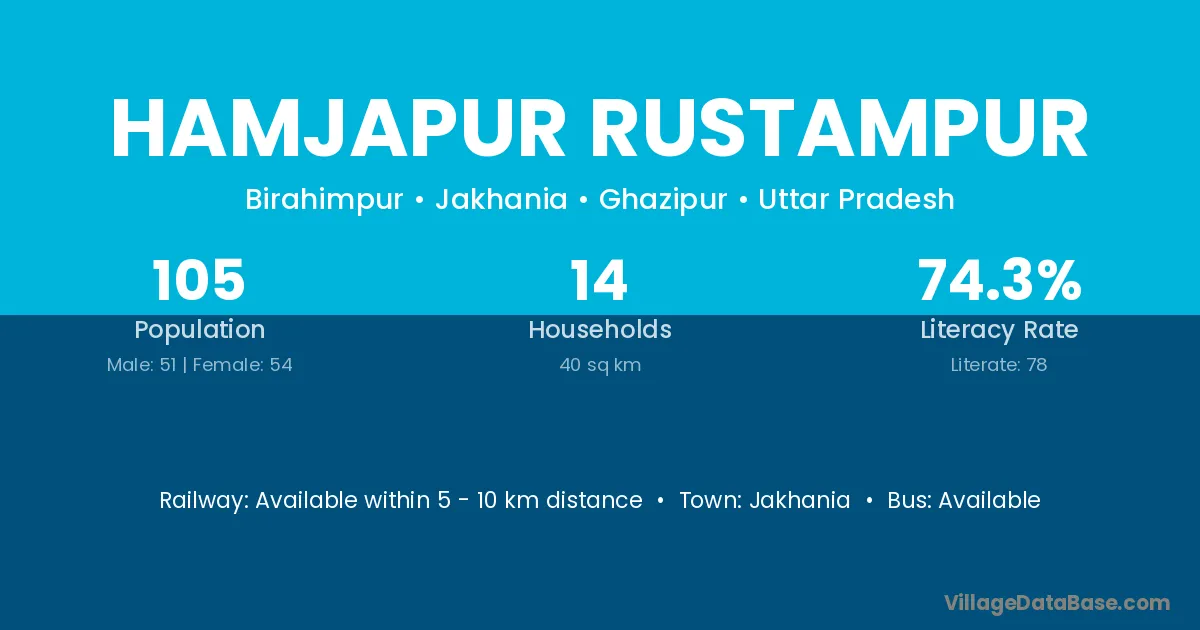 Hamjapur Rustampur village has a total population of 105 people, of which 51 are males and 54 are females.