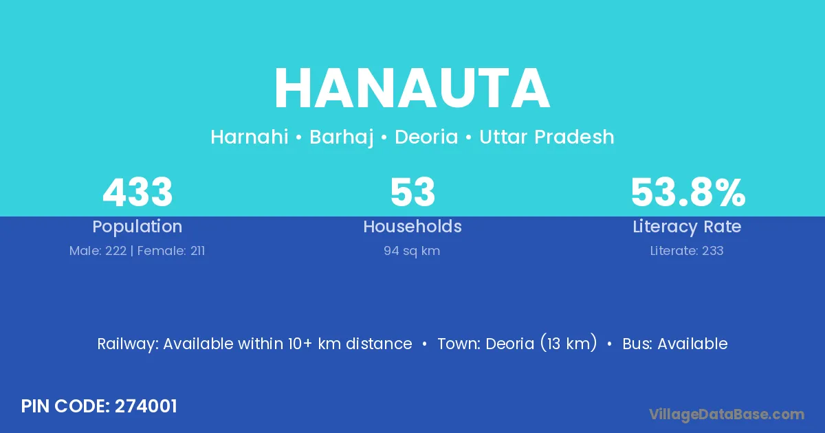 Hanauta village has a total population of 949 people, of which 478 are males and 471 are females.
