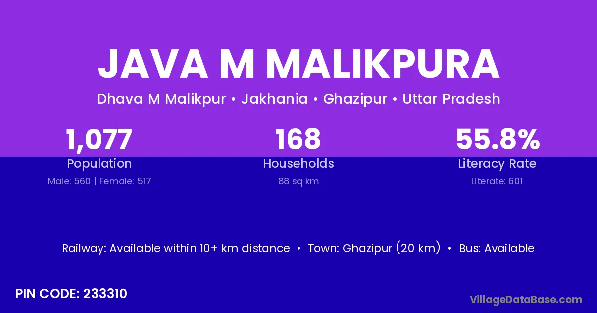 Ghazipur (20 km) is the nearest town to Java M Malikpura village for major economic activities and is located approximately 20 km away.