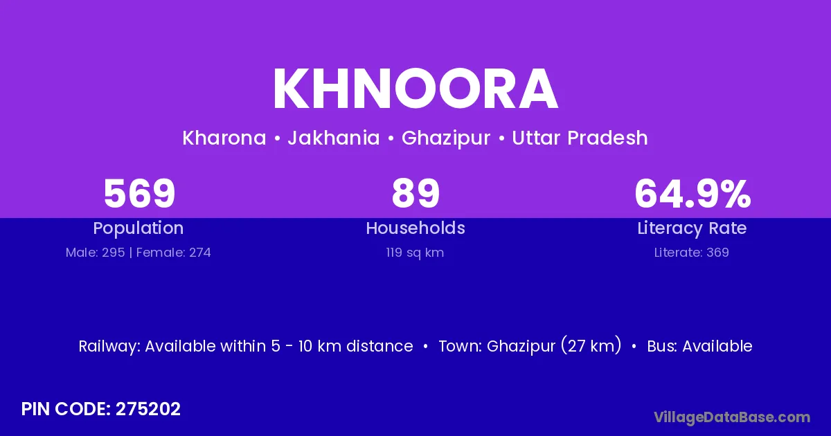 Ghazipur (27 km) is the nearest town to Khnoora village for major economic activities and is located approximately 27 km away.