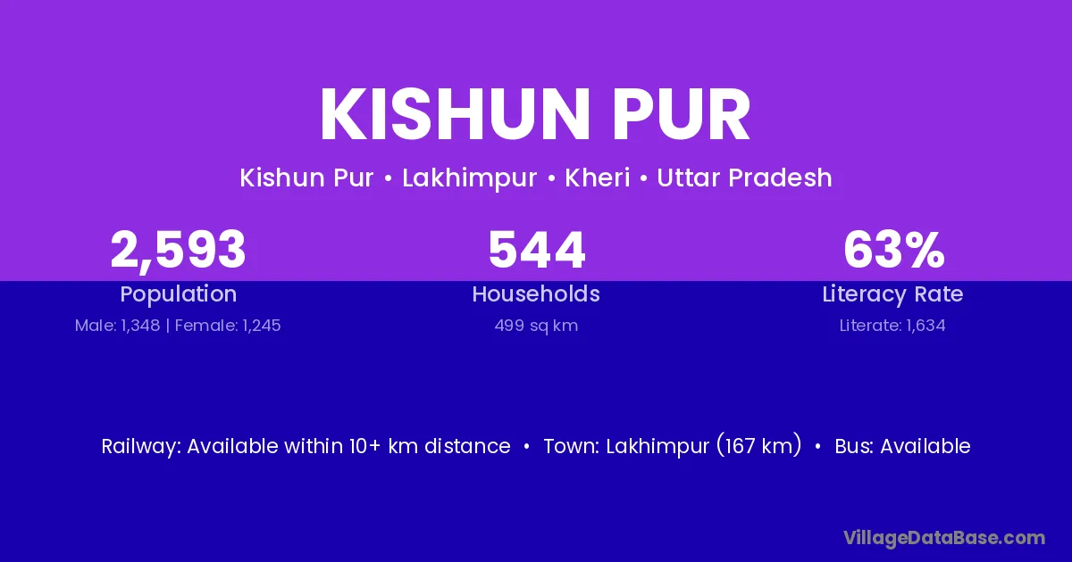 The literacy rate of Kishun Pur village is 61.36%. Male literacy stands at 72.46% and female literacy at 50.90%.
