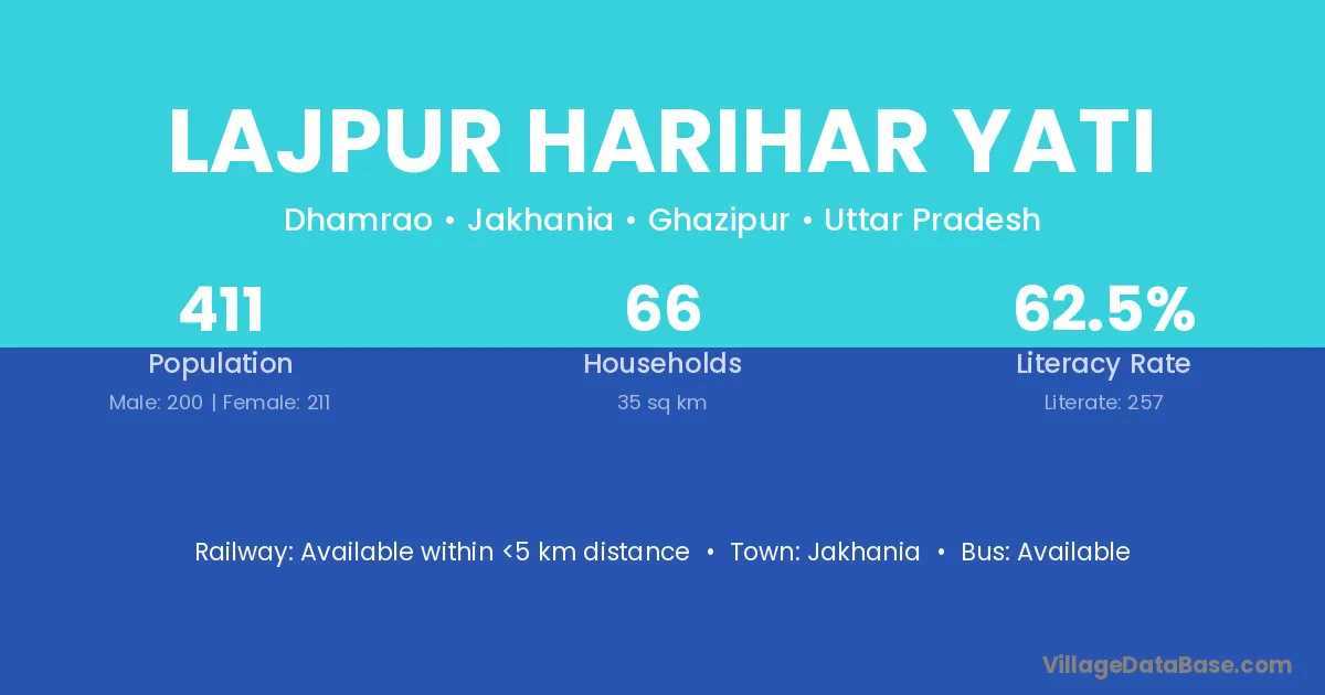 Lajpur Harihar Yati village has a total population of 411 people, of which 200 are males and 211 are females.