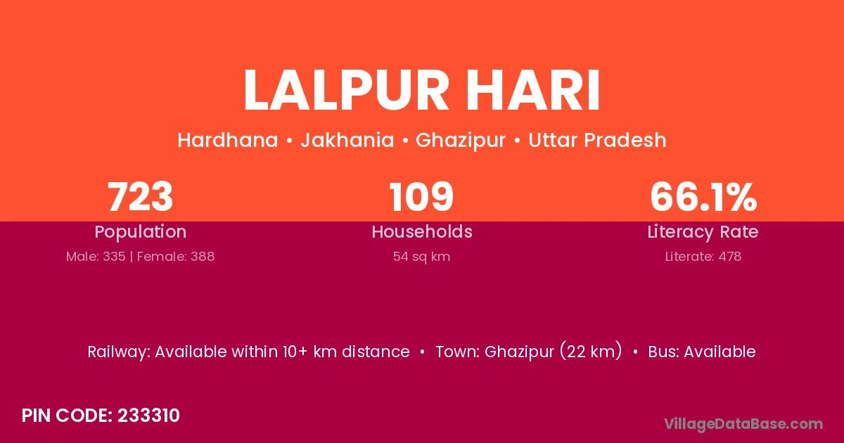 Ghazipur (22 km) is the nearest town to Lalpur Hari village for major economic activities and is located approximately 22 km away.
