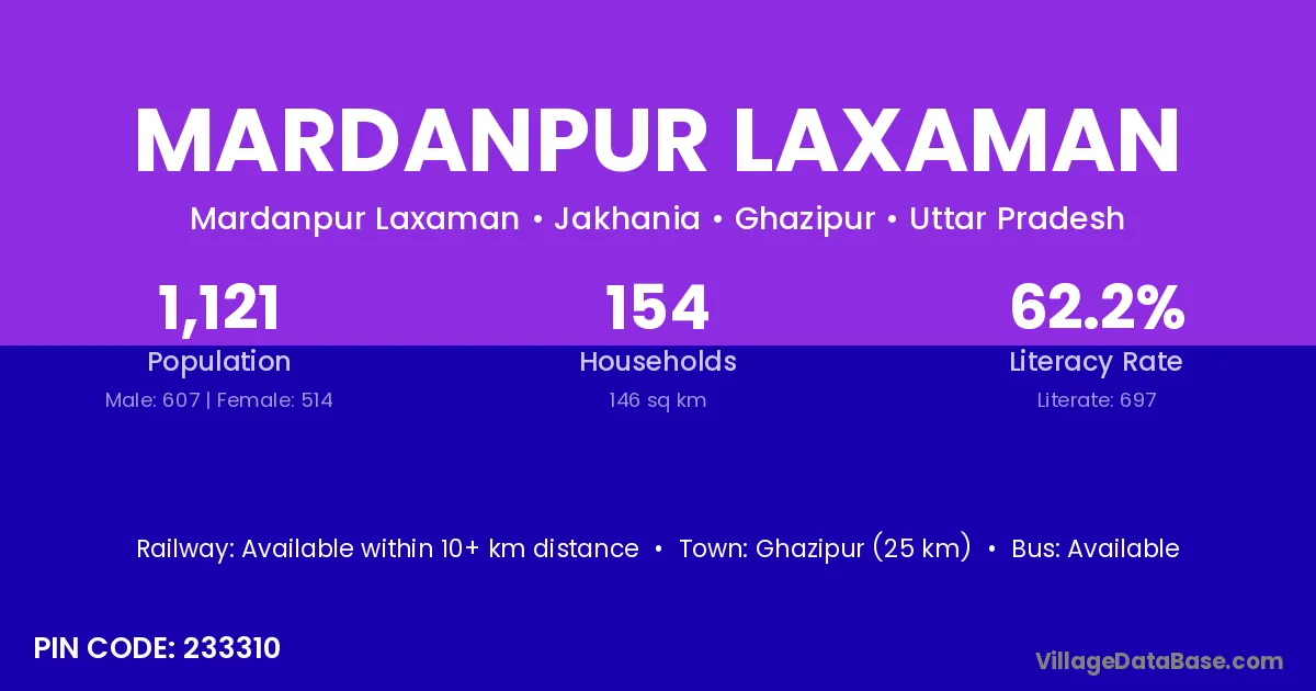 Ghazipur (25 km) is the nearest town to Mardanpur Laxaman village for major economic activities and is located approximately 25 km away.