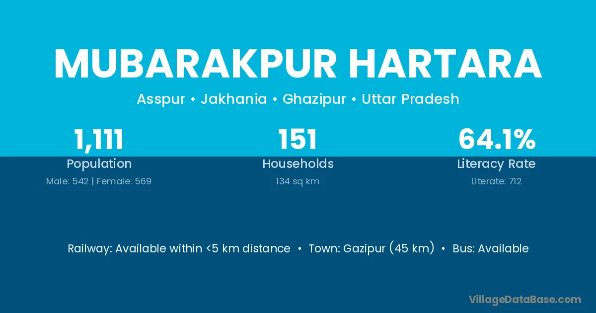 Gazipur (45 km) is the nearest town to Mubarakpur Hartara village for major economic activities and is located approximately 45 km away.