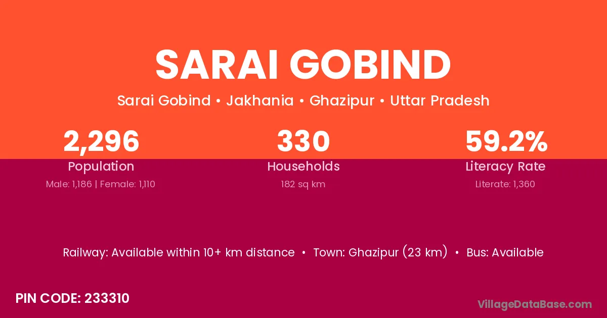 Ghazipur (23 km) is the nearest town to Sarai Gobind village for major economic activities and is located approximately 23 km away.