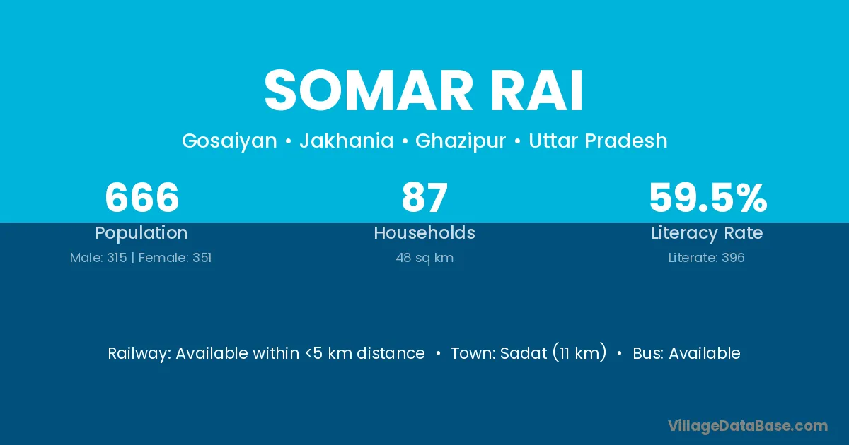 Somar Rai village is located in the Jakhania Tehsil of the Ghazipur district in Uttar Pradesh .