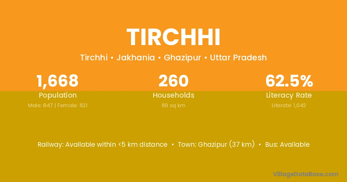 Ghazipur (37 km) is the nearest town to Tirchhi village for major economic activities and is located approximately 37 km away.
