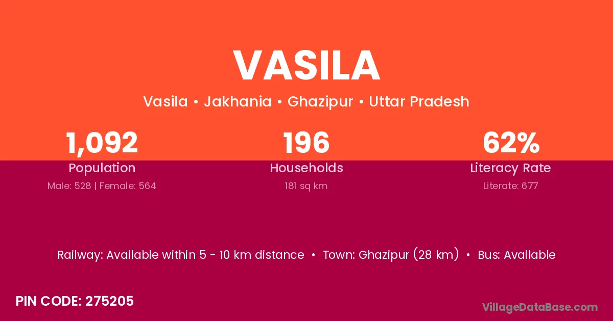Ghazipur (28 km) is the nearest town to Vasila village for major economic activities and is located approximately 28 km away.