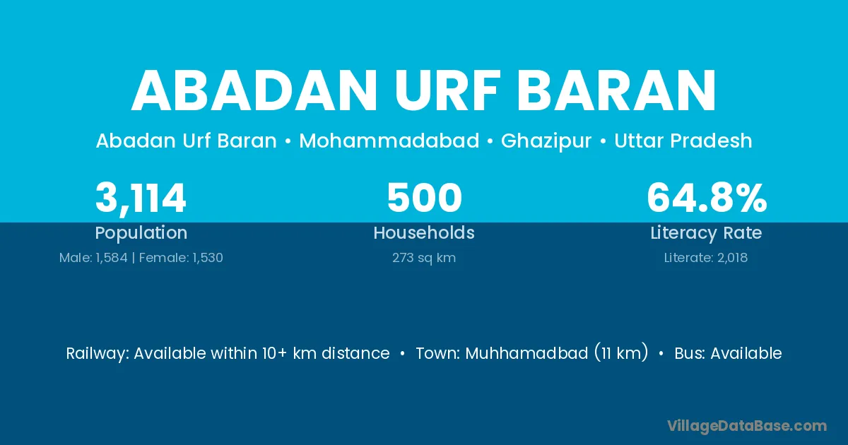 Abadan Urf Baran village has a total population of 3,114 people, of which 1,584 are males and 1,530 are females.