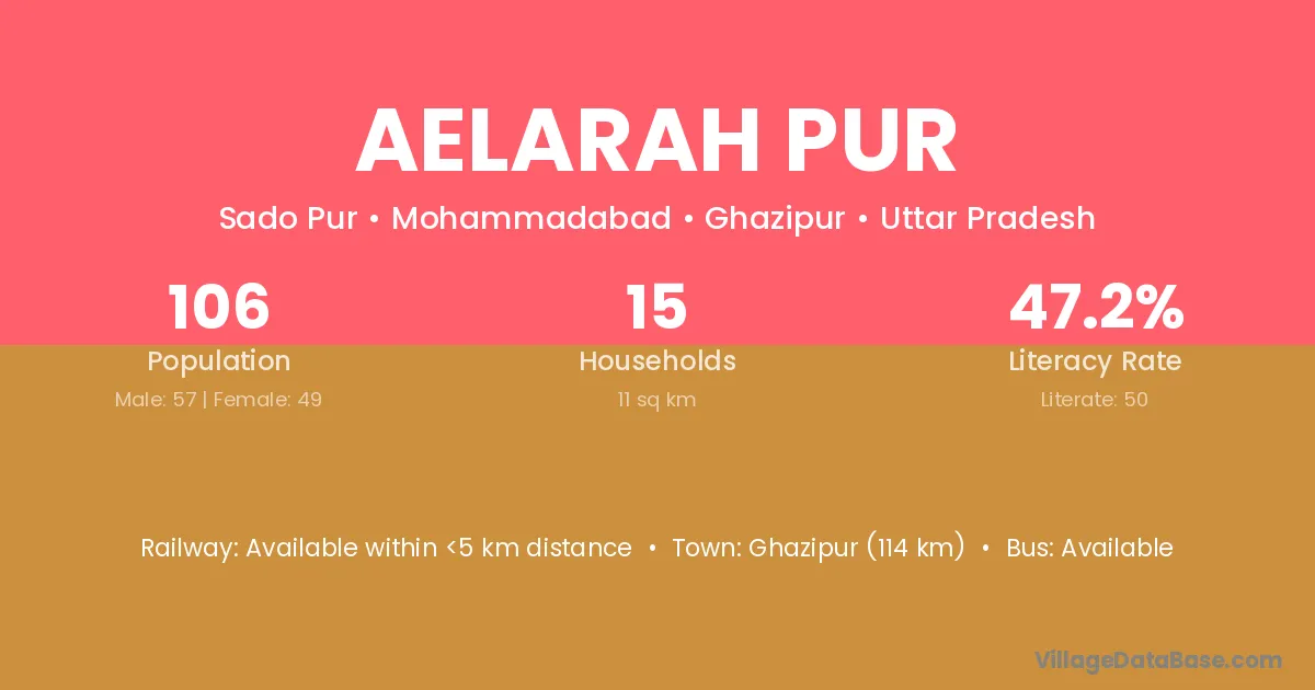 Ghazipur (114 km) is the nearest town to Aelarah Pur village for major economic activities and is located approximately 114 km away.