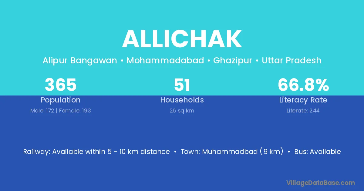 Muhammadbad (9 km) is the nearest town to Allichak village for major economic activities and is located approximately 9 km away.