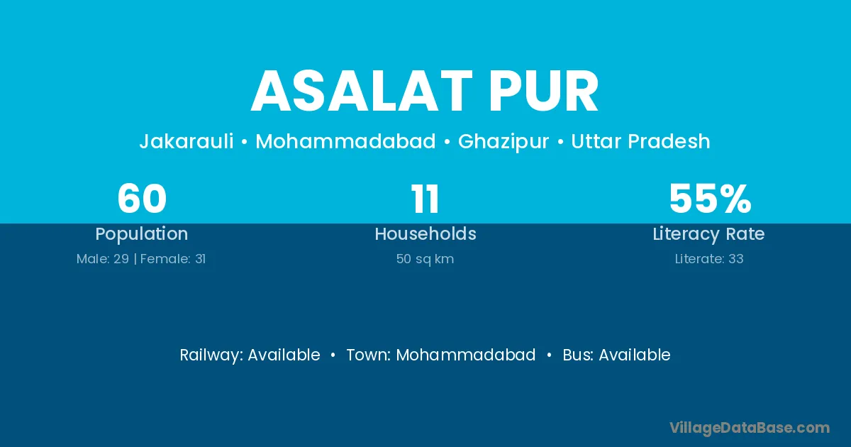 The literacy rate of Asalat Pur village is 55.00%. Male literacy stands at 72.41% and female literacy at 38.71%.