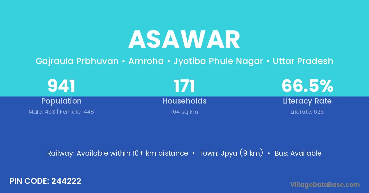 Asawar village has a total population of 6,300 people, of which 3,195 are males and 3,105 are females.