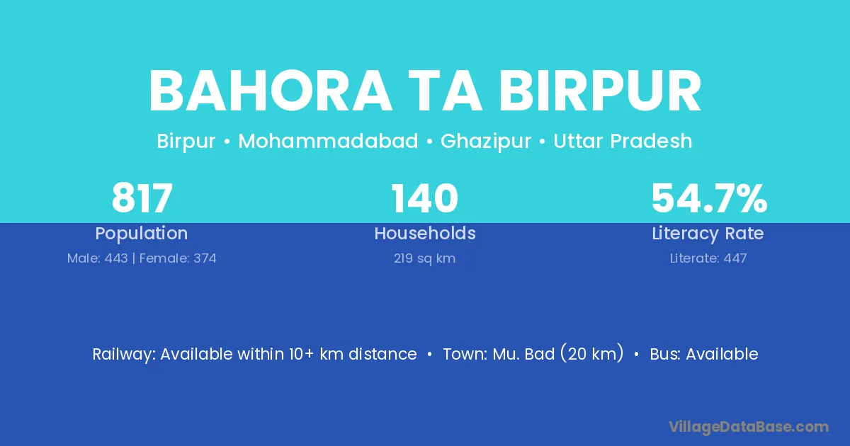 Mu. Bad (20 km) is the nearest town to Bahora Ta Birpur village for major economic activities and is located approximately 20 km away.
