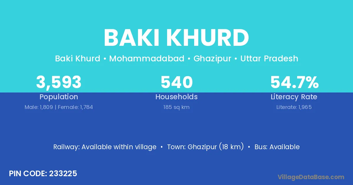 Ghazipur (18 km) is the nearest town to Baki Khurd village for major economic activities and is located approximately 18 km away.