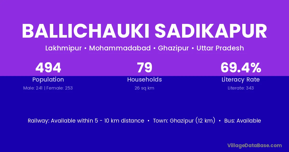 Ballichauki Sadikapur village has a total population of 494 people, of which 241 are males and 253 are females.