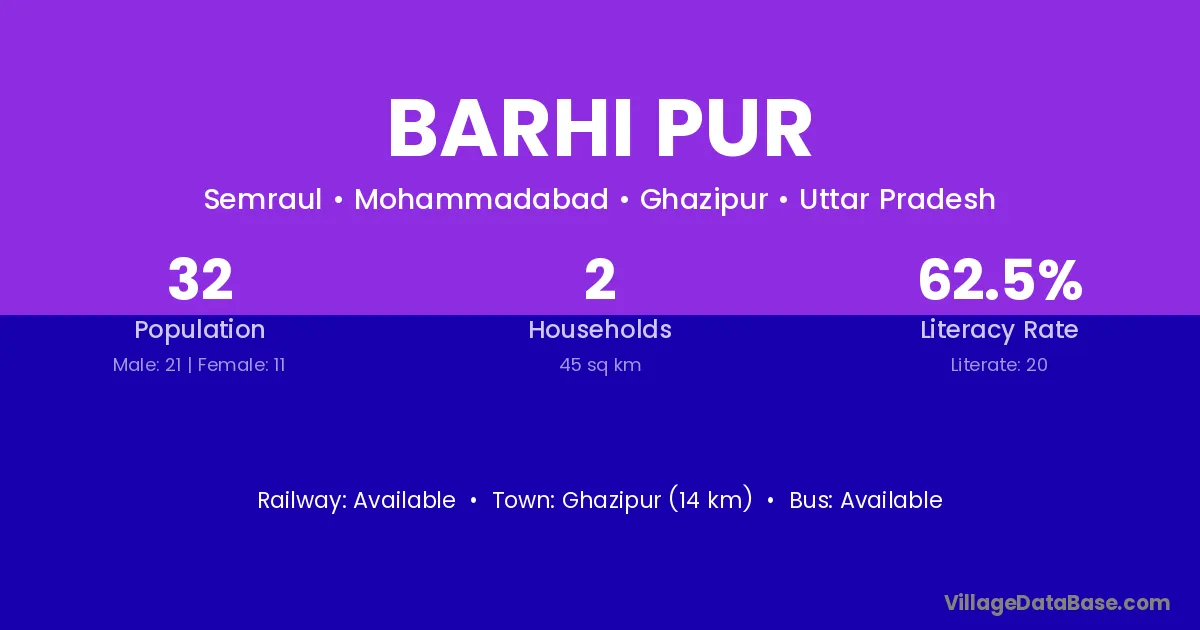 Ghazipur (14 km) is the nearest town to Barhi Pur village for major economic activities and is located approximately 14 km away.
