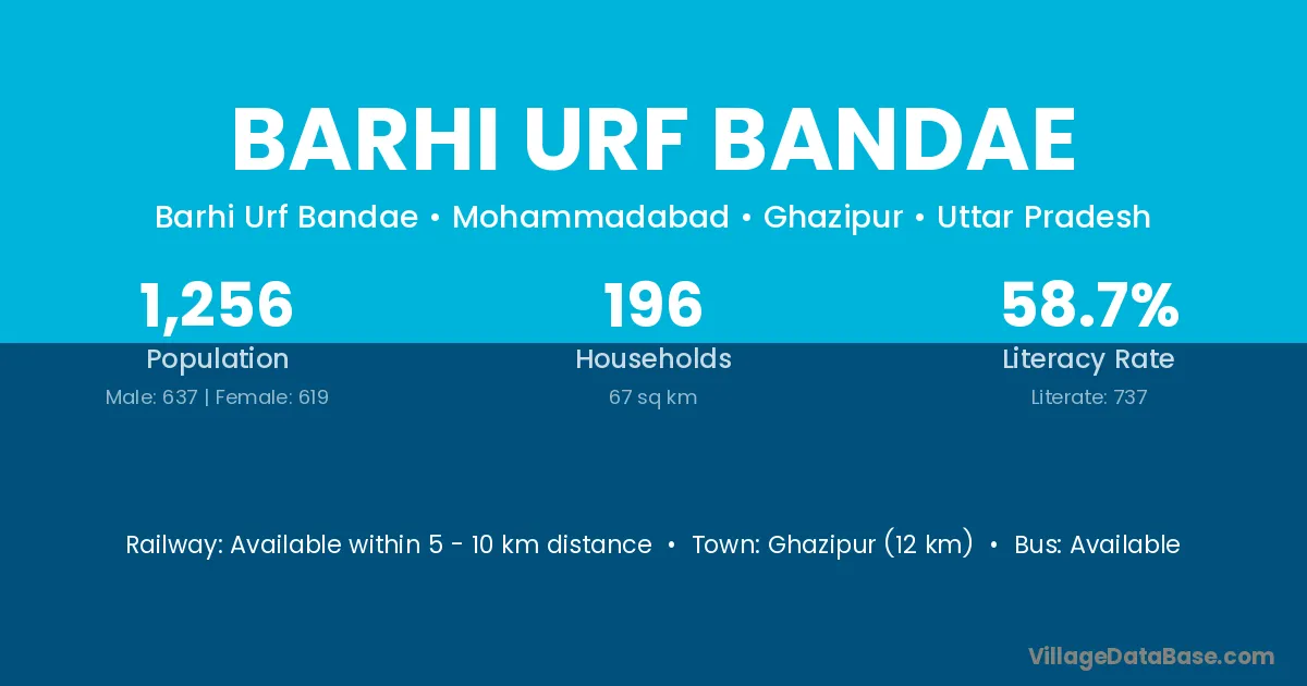 Ghazipur (12 km) is the nearest town to Barhi Urf Bandae village for major economic activities and is located approximately 12 km away.