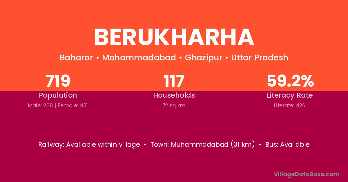 Muhammadabad (31 km) is the nearest town to Berukharha village for major economic activities and is located approximately 31 km away.