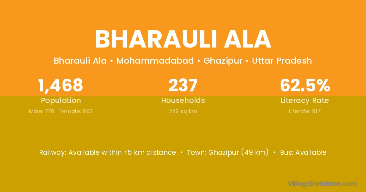 Ghazipur (49 km) is the nearest town to Bharauli Ala village for major economic activities and is located approximately 49 km away.
