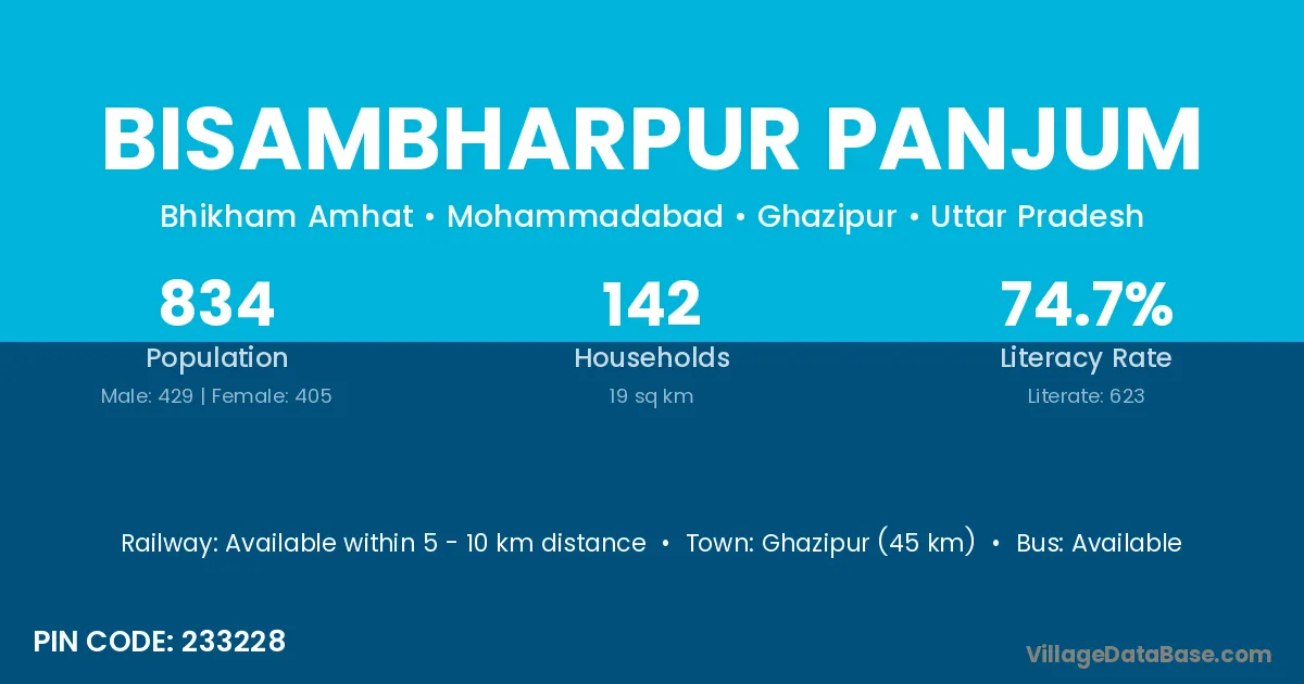 Ghazipur (45 km) is the nearest town to Bisambharpur Panjum village for major economic activities and is located approximately 45 km away.
