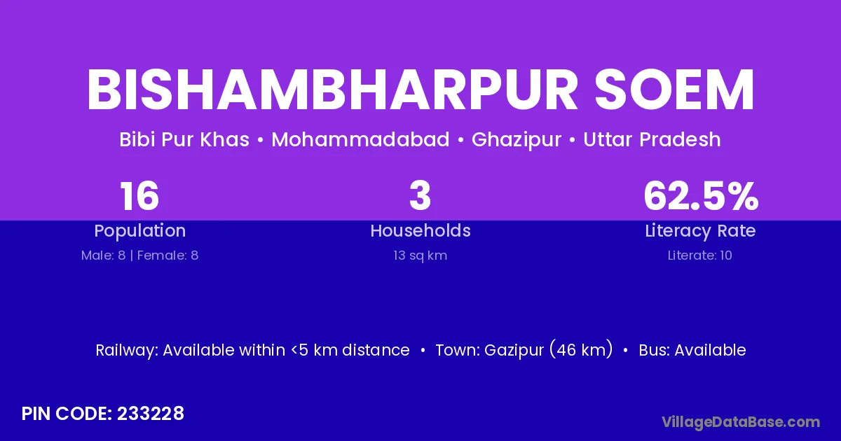 Bishambharpur Soem village has a total population of 16 people, of which 8 are males and 8 are females.