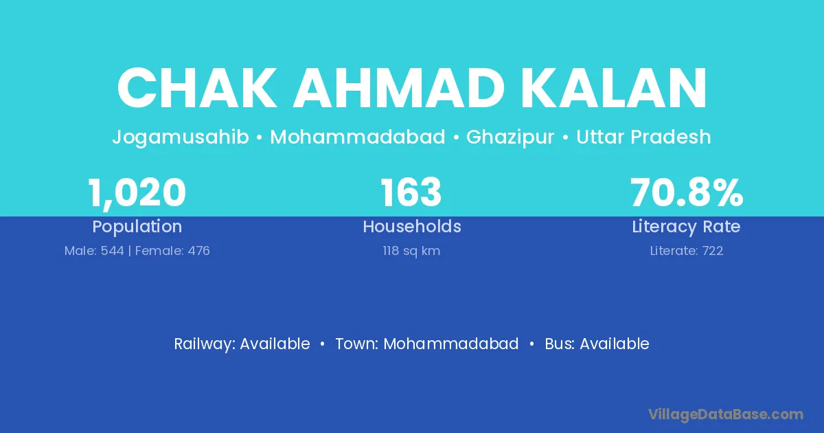 Chak Ahmad Kalan village has a total population of 1,020 people, of which 544 are males and 476 are females.