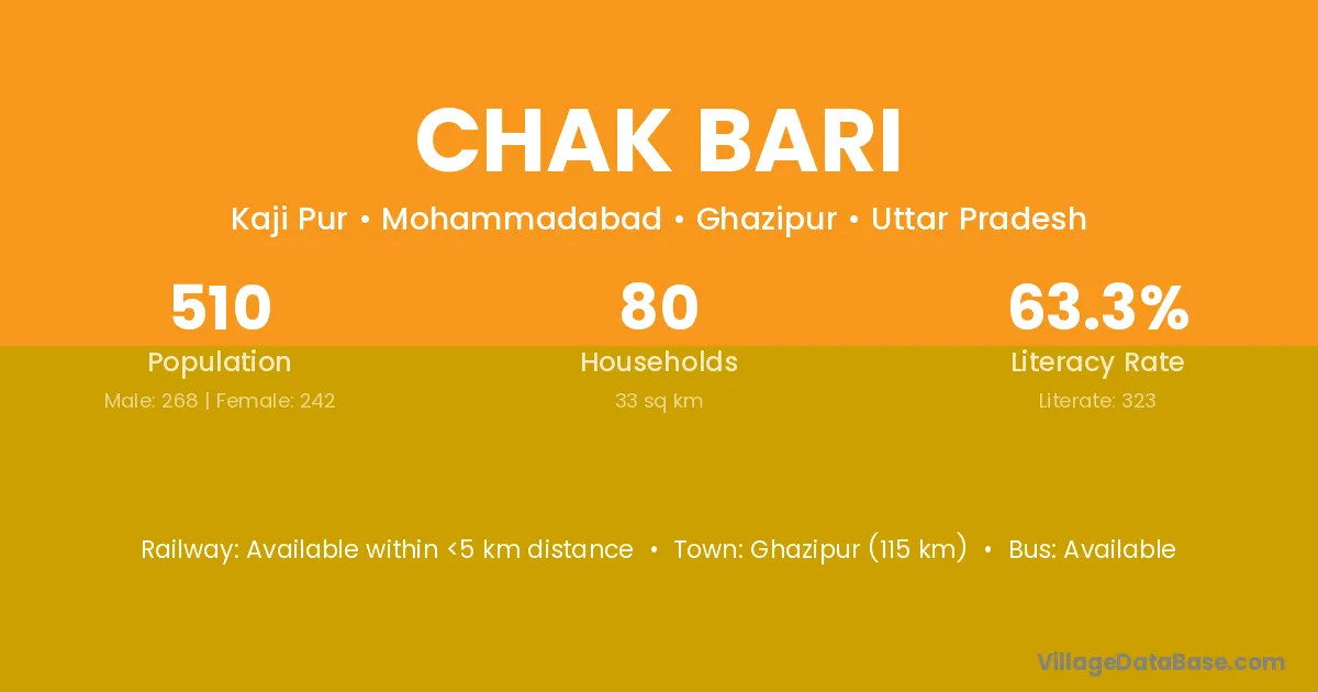 Ghazipur (115 km) is the nearest town to Chak Bari village for major economic activities and is located approximately 115 km away.