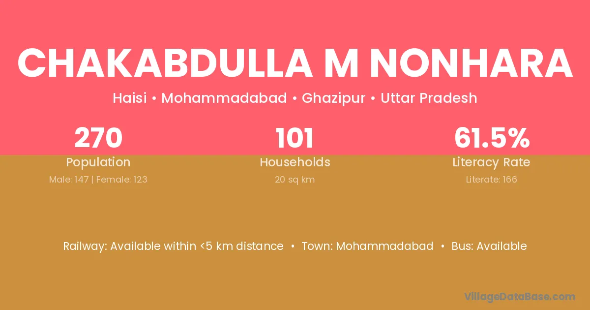 Chakabdulla M Nonhara village has a total population of 270 people, of which 147 are males and 123 are females.