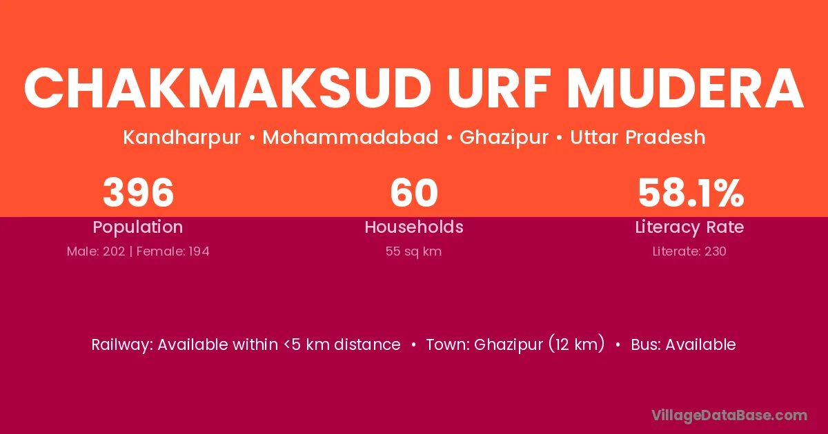 Chakmaksud Urf Mudera village has a total population of 396 people, of which 202 are males and 194 are females.