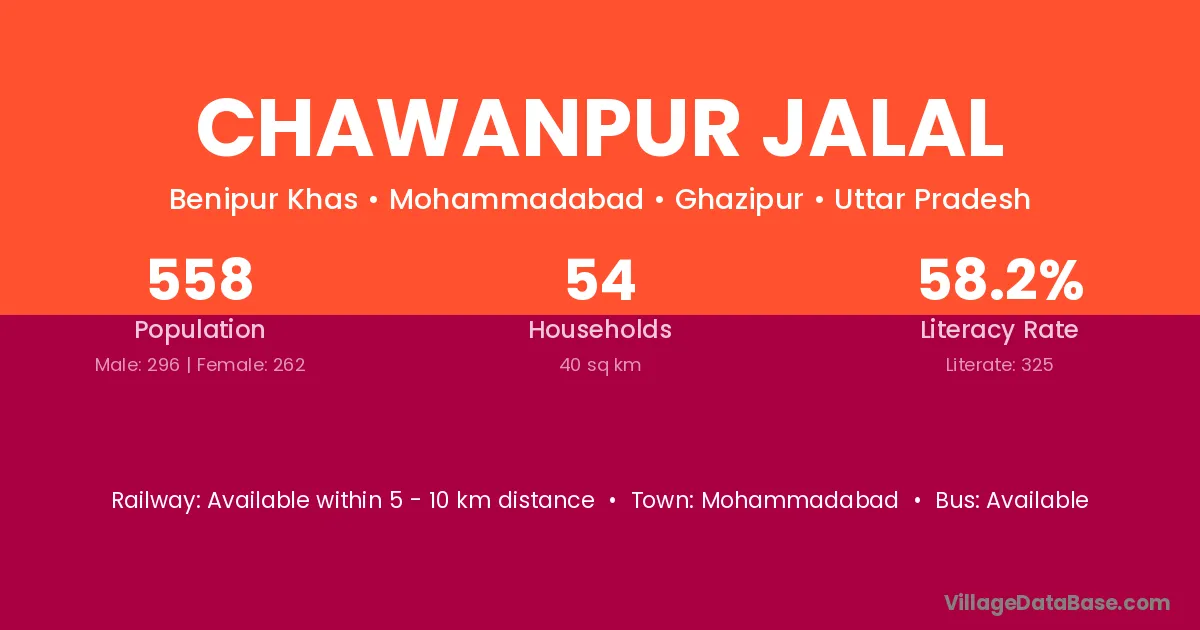 Chawanpur Jalal village has a total population of 558 people, of which 296 are males and 262 are females.