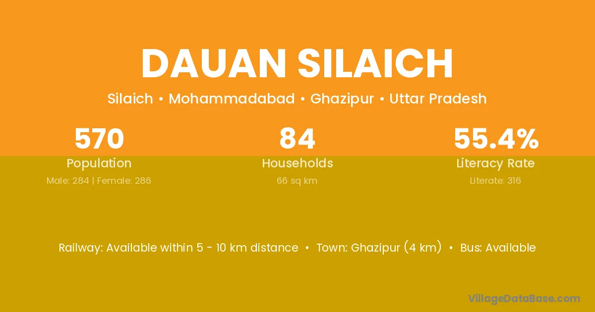 Ghazipur (4 km) is the nearest town to Dauan Silaich village for major economic activities and is located approximately 4 km away.