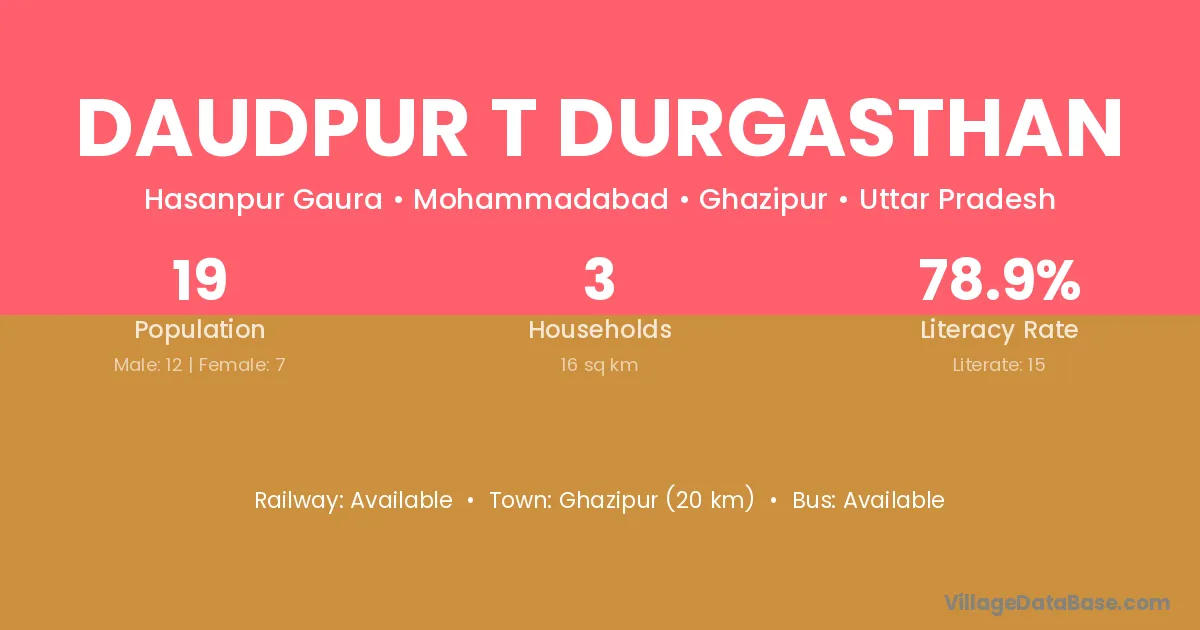 Ghazipur (20 km) is the nearest town to Daudpur T Durgasthan village for major economic activities and is located approximately 20 km away.