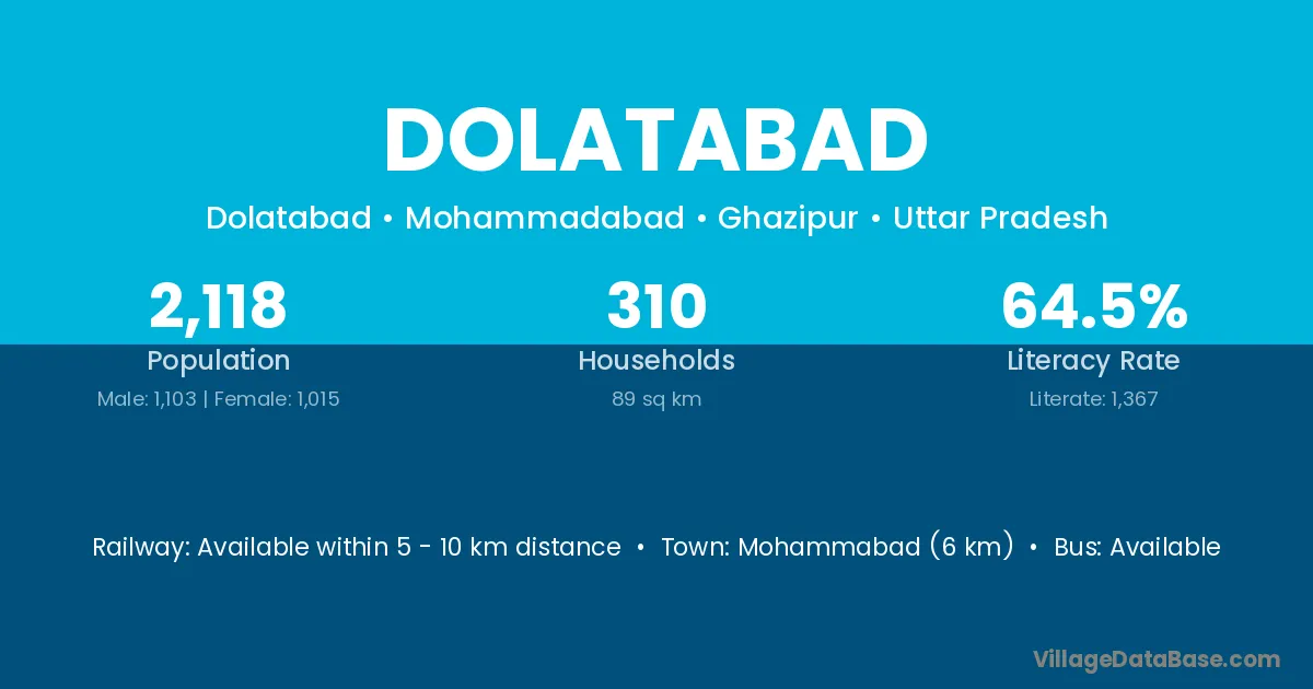 Dolatabad village has a total population of 2,118 people, of which 1,103 are males and 1,015 are females.