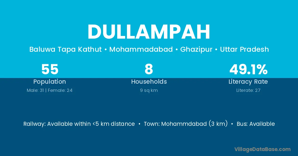 Mohammdabad (3 km) is the nearest town to Dullampah village for major economic activities and is located approximately 3 km away.