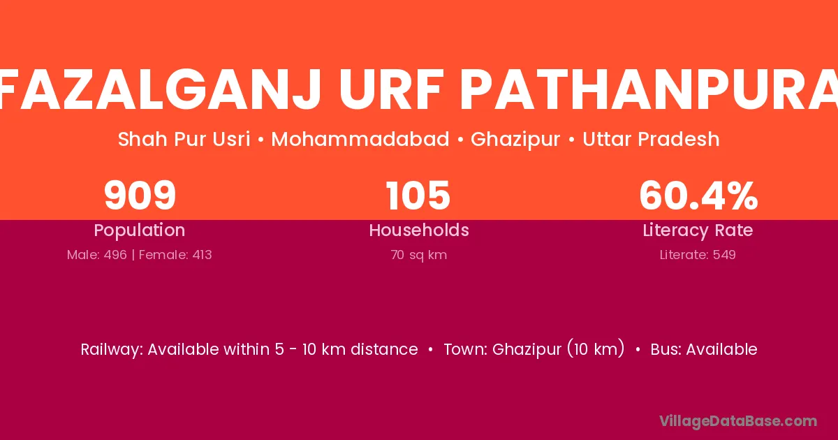 Fazalganj Urf Pathanpura village has a total population of 909 people, of which 496 are males and 413 are females.