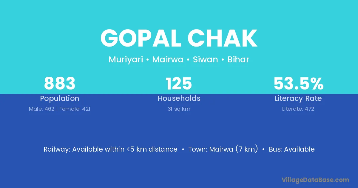 Ghazipur (40 km) is the nearest town to Gopal Chak village for major economic activities and is located approximately 40 km away.