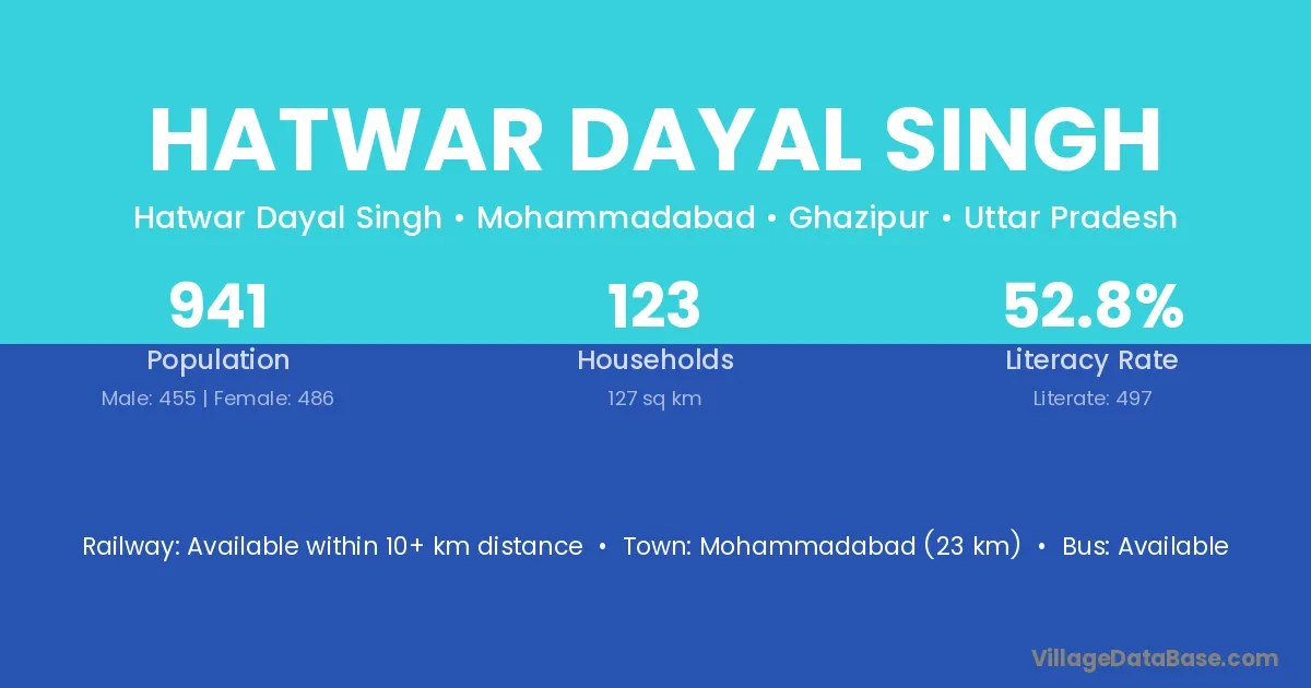 Mohammadabad (23 km) is the nearest town to Hatwar Dayal Singh village for major economic activities and is located approximately 23 km away.