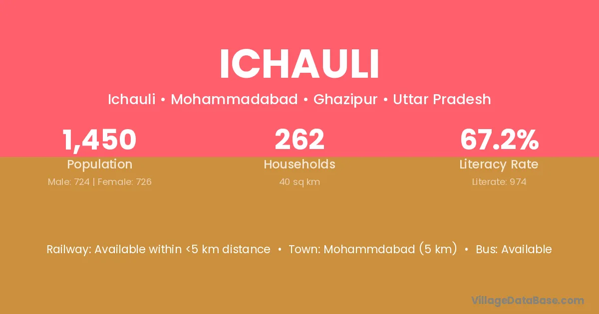 Ichauli village has a total population of 1,450 people, of which 724 are males and 726 are females.
