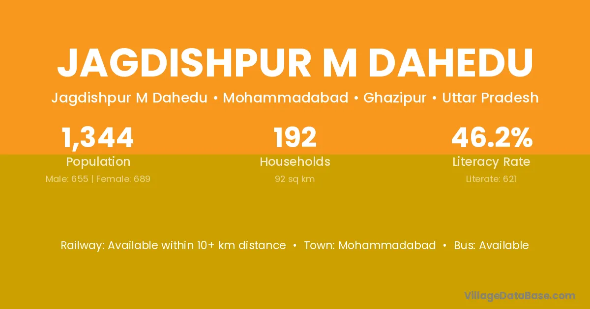 Jagdishpur M Dahedu village has a total population of 1,344 people, of which 655 are males and 689 are females.