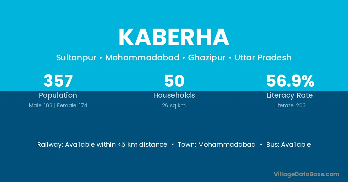 The literacy rate of Kaberha village is 56.86%. Male literacy stands at 70.49% and female literacy at 42.53%.