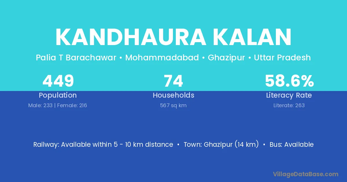 Ghazipur (14 km) is the nearest town to Kandhaura Kalan village for major economic activities and is located approximately 14 km away.