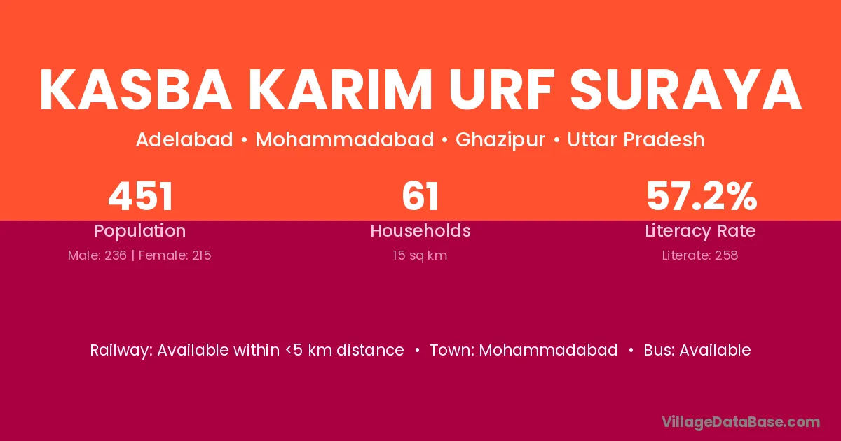 Kasba Karim Urf Suraya village has a total population of 451 people, of which 236 are males and 215 are females.