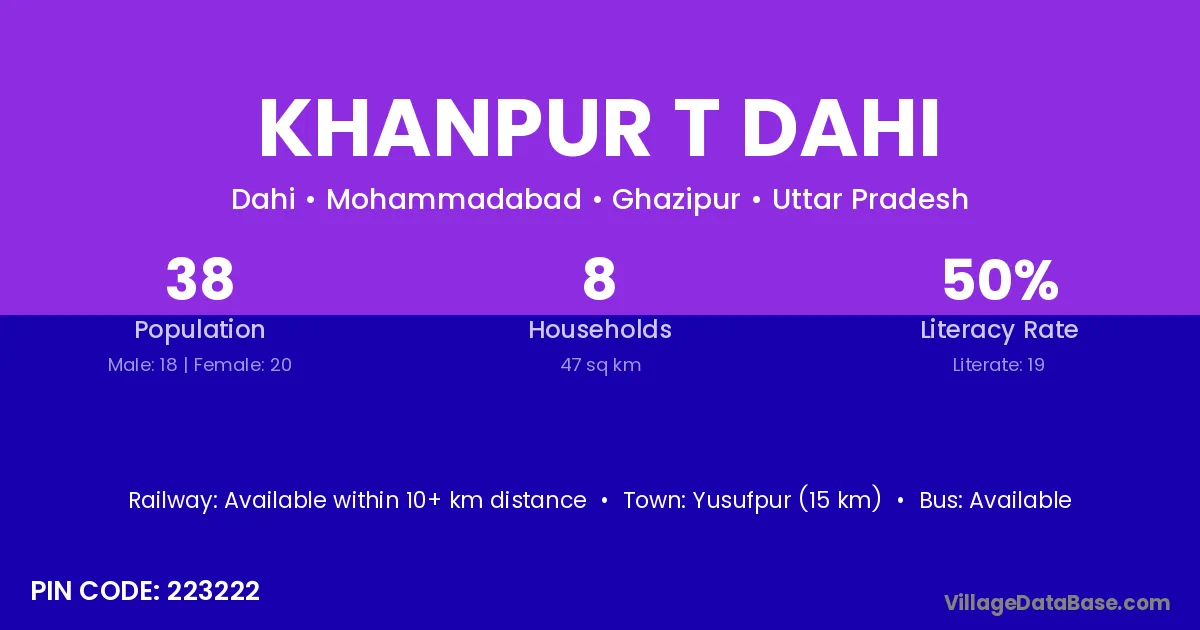 Yusufpur (15 km) is the nearest town to Khanpur T Dahi village for major economic activities and is located approximately 15 km away.