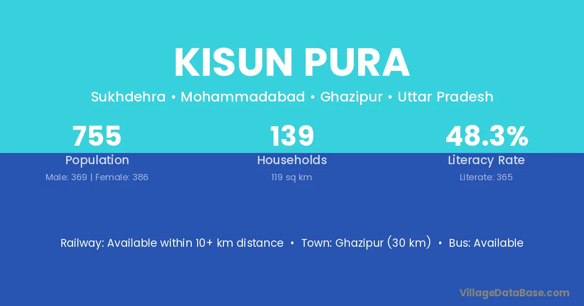 Ghazipur (30 km) is the nearest town to Kisun Pura village for major economic activities and is located approximately 30 km away.