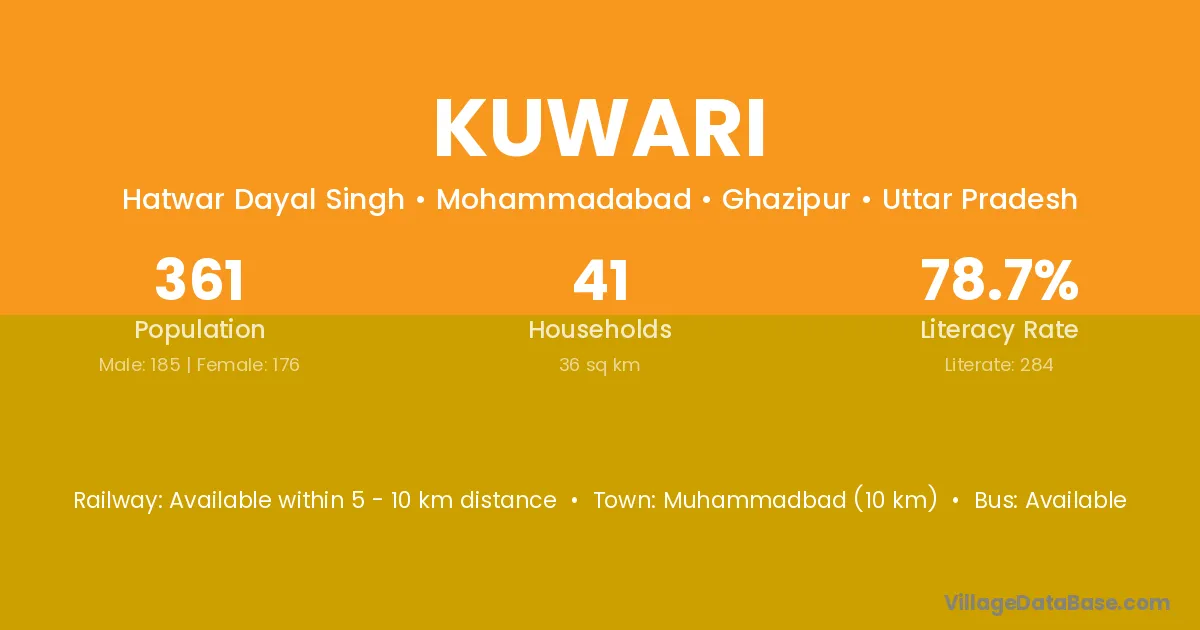 Kuwari village has a total population of 361 people, of which 185 are males and 176 are females.